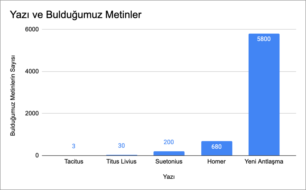 Bu sayılar ne ifade eder? Diğer eski metinlere göre çok mu yoksa az mı? Perspektife yerleştirmek için başka birinci yüzyıldaki elyazmalarına bakmalıyız. Mesela İncil’in yazıldığı zamanda birkaç Romalı tarihçi de yazıyorlardı. Bunlardan biri olan Tacitus, Roma’da olup bitenleri kaydediyordu. O döneme ait bilgilerimizin çoğunu tarihçi Tacitus’dan öğreniyoruz. Ancak Tacitus’un yazılarının sadece 3 kopyası bulundu. Roma tarihiyle ilgili bilgilerimizin çoğu bu 3 metne dayanır. Ayrıca bu 3 elyazmasının en eski kopyası, onuncu yüzyıldan kalma; yani Tacitus yaşadıktan 800 yıl sonrasına ait bir kopya. Oysa İncil metninin daha çok eski ve güvenilir elyazmaları vardır. İncil’in bulunan en eski elyazması olan P52 ile orjinal mektubun arasında sadece 35 yıl kadar fark var. Diğer birinci yüzyıldaki metinlere göre İncil elyazmaları bambaşka bir kategoridedir. Çünkü daha çok ve daha eski metinleri mevcuttur. Genel olarak birinci yüzyıla ait bir metnin ortalama sadece 20 tane kopyası vardır. Bu metinlerle İncil’in kıyaslaması aşağıdadır: